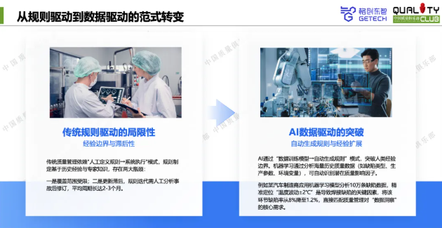 当前,制造业质量管理仍困囿于人工依赖、数据割裂与规则滞后等现状。赵志表示,传统质量管理的从“人工定义规则”到“系统执行”模式,覆盖范围有限且更新滞后。相比之下,AI通过“数据训练模型”到“自动生成规则”方式,可以打破人类经验的边界。AI机器学习通过分析海量历史质量数据(如缺陷类型、生产参数、环境变量),自动识别潜在的质量影响因子。例如,某汽车制造商应用机器学习模型精准定位温度波动±2℃是导致焊接缺陷的关键因素,将该环节的缺陷率从8%降至1.2%,直接匹配质量管理对“数据洞察”的核心需求。由此,赵志建议要从规则驱动向AI数据驱动开展质量管理范式转变。